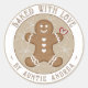 Hier ist ein fröhlicher kleiner Lebkuchenmann mit kleinen Herzknöpfen auf seinem Shirt und einem warmen roten Herz in seiner Hand vor einem Hintergrund von süßen, eisigen Lebkuchenschneeflocken. Genießen Sie die Jahreszeit! Fügen Sie Ihre eigene Nachricht hinzu oder personalisieren Sie mit Ihrem Namen und Ihrer Adresse, um als Umschlag Aufkleber zu verwenden! Ideal für Bäcker oder als kleines Geschenk für Ihren Lieblings-Bäcker oder für alle, die Lieben Lebkuchen!