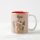 Lebkuchen mit einer Kirsche auf der oberen Zwei-Tonen-Tasse. Niedlicher Lebkuchenmann mit den größten Augen und Lächeln, stehend nah von seinen Süßigkeiten mit einer Kirsche auf dem Hut. Editieren Sie einfach Ihren Namen oder Ihre Hintergrundfarbe, um Ihre Urlaubsdekoration anzupassen.