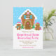 Diese niedliche und festliche Einladung besticht durch ein niedliches Lebkuchenhaus, das mit rosa und grünen Süßigkeiten dekoriert ist. Daneben sind bezaubernde Lebkuchenmänner mit Geschenken, in Weihnachtsmannmützen und Schal gekleidet. Im Hintergrund ist ein hellblauer Winterhimmel mit eleganten fallenden Schneeflocken. Der Text verbindet dekorative und serifenlose Schriftart für einen stilvollen und modernen Look. Das ist ideal für ein Lebkuchenhaus, das Party schmückt.