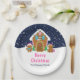 Dieser niedliche und festliche Teller besticht durch ein niedliches Lebkuchenhaus, das mit rosa und grünen Süßigkeiten dekoriert ist. Daneben sind bezaubernde Lebkuchenmänner mit Geschenken, in Weihnachtsmannmützen und Schal gekleidet. Im Hintergrund ist ein marineblauer Winterhimmel mit eleganten fallenden Schneeflocken. Der Text verbindet dekorative und serifenlose Schriftart für einen stilvollen und modernen Look. Dies ist ideal für ein Weihnachtsgebäck mit Party.