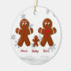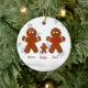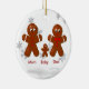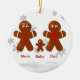 Ein grafischer Vektor einer dreiköpfigen Lebkuchenfamilie auf einem Weihnachtsschmuck. Das Ornament hat vorne Vorlagen für Ihre Namen und eine optionale Vorlage auf der Rückseite.