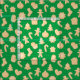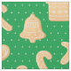 Dieses niedliche Baumwollgewebe aus Urlaubskleidung ist mit einem Muster aus Brotkeksen aus Strumpf, Lebkuchen, Kerzen, Glocken, Weihnachtsbäumen und vielem mehr im Grün mit weißen Punkten ausgestattet. Entworfen von der Künstlerin Susan Coffey.