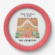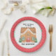 Auf dieser Papiertafel befindet sich ein festliches Gingerbrothaus, das mit roten, aqua- und grünen Gumplänen auf weißem Hintergrund mit einem roten und weißen Polka-Punkt-Außenrand dekoriert ist. Oberhalb des Lebkuchenhauses steht der Text "von unserem Haus zu Ihrem" Sie können mit Ihrem Familiennamen personalisieren. Koordiniert die Cookie Exchange-Auflistung.