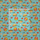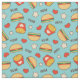 Entzückendes blaues Gewebe mit Cheeseburgern, Fischrogen, Herzen und Sternen. Yum!