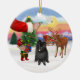 Der Weihnachtsmann bietet seinem schwarzen Spitz eine Leckerei, während die Elfen den Schlitten vor der großen Nacht beladen.