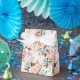Gastgeschenk Leckerei Box wird mit einem schönen rosa und blau mehrfarbigen Blumendruck gezeigt. Passen Sie dieses Objekt an oder kaufen Sie, wie es ist. Tipp: Fügen Sie einfach Ihre großen Leckereien hinzu und fügen Sie ein festliches Band hinzu. Lizenziertes Bild