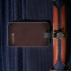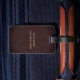 Moderner, unbedeutender brauner lederner Blick, männlicher mit Monogramm Reisegepäckumbau. Mit Monogramm Name auf vorderer unterer Ecke im Taupe mit Maßtropfenschatteneffekt. Schriftartart und -farben können geändert werden. Elegantes, LuxusImitat brüniert ledernen Musterbeschaffenheitshintergrund. Rückseite hat den gleichen ledernen Blickdruckhintergrund. DIY Textschablone an zurück zu addieren Namen und Telefonnummer oder bevorzugte Kontaktinformationen. Anmerkung: Bilder werden gedruckt. Nicht tatsächliches Leder. Stilvoll, Führungskraftart-Gepäckumbau für ihn.