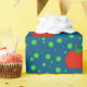 Blauer Hintergrund mit grünen Polka-Punkten und roten Äpfeln mit einem grünen Wurm, der aus ihnen kommt. Diese Geschenkpackung ist eine Idee für ein Lehrergeschenk.