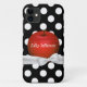 Hübscher iPhone 5 Gehäuse mit einer Grafik einer kleinen Blume auf saftig rot, vor einem schwarz-weißen Polka Punkt Hintergrund. Die Grafik eines weißen Bandes und Bogens läuft über den Grund des Apfels. Personalisieren Sie den weißen Text. Ideal für sich selbst oder als Geschenkidee für Ihren Lieblingslehrer.