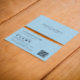 Einfache hellblaue Leinenstruktur mit schwarzer, anpassbarer Typografie. Social Media Icons und ein QR Code.