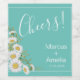 Hübsches Hochzeitsweinetikett mit einer farbenfrohen, weißen Molkereiecke auf aquamarinem Hintergrund mit weißen, anpassbaren Textblöcken in modernen Schriftart