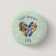 Niedlicher kleiner Button-Back Button, der ein leichtes Mädchen sagt. mit einem Aquarellbild von Federn in Herzform. Set auf Vintagem, minzgrünen Hintergrund mit verblassten rosa und weißen Polka Punkten.