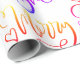 Fröhliche und helle Phrase in der Regenbogenskriptkalligraphie in einem wiederholten Muster für einen lebendigen Weihnachtsfeiertag verpackt Papier Stil für Ihre Geschenke.