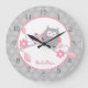 Die Uhr zeigt unsere niedlichen rosa und grauen Eulen auf einem Zweig mit bunten Blume. Das neue Design bietet dunkelgraue Zahlen auf einem hellgrauen Punkt-Hintergrund, und der Name kann in einem Skripttext geschrieben werden. Klicken Sie auf die Schaltfläche "Personalisieren" und dann auf "Weiter anpassen", wenn Sie den Schriftart ändern (oder den Namen löschen möchten)