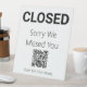 In der obersten Textzeile steht CLOSED. In der Erholung des Textes steht, Entschuldigung, dass wir dich vermisst haben. Es gibt einen QR-Code für den Platzhalter. (Denken Sie daran, Ihre URL einzugeben, damit der QR-Code korrekt funktioniert.) In der Ergebniszeile steht "Nach unseren Stunden suchen". Der Text ist schwarz. Das Tischschild ist weiß. Alle Texte können bearbeitet oder gelöscht werden.