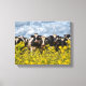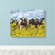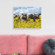 Diese gewickelte Leinwand zeigt eine Reihe schwarz-weißer Kühe, die hinter einem Stacheldrahtzaun stehend sind. Im Vordergrund ist hellgelbes Unkraut und dahinter ein turbulenter blau-grauer Himmel. Es wäre ein perfekter Pop von Farben, wo auch immer man sie zeigt.