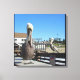 Pelikane sonnen sich auf dem Steg. Redondo Beach, Calif. Strand Szene, Sand und Palmen im Hintergrund. Die Pelikane, die voressen, die Schnüre, die vor den Truhen nach unten zeigen.