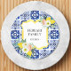 Mit diesem klassischen Rundaufkleber können Sie jeden Anlass abrunden! Die gelbe Zitronenzitruskonstruktion, das marineblaue mediterrane Fliesenmuster und der botanische Charme der Blumen.