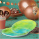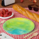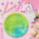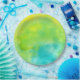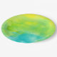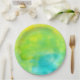 Eine Zitronengelbe und türkisblaue Aquarellstruktur. Die Farben mischen sich und vermischen sich, um ein ruhiges Grün zu schaffen, und verwirren sich, um wolkenähnliche Formen und Farbblüten zu schaffen.