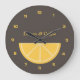 Eine braune Wanduhr mit gelbem Zitronenhalsschnitt und anpassbarem Text. Es kann für Zuhause oder Bürodekoration verwendet werden. Sie können auch ein neues Geburtstagsgeschenk für Ihren besten Freund machen!