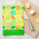 Küchenhandtuch mit farbenfrohen Zitrusfrüchtemustern aus Zitronen, Limetten und Orangen auf weißen, orangefarbenen, aquamarinen und gelben Plätzen mit einer grünen Kalkleiste.