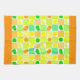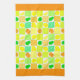 Küchenhandtuch mit farbenfrohen Zitrusfrüchtemustern aus Zitronen, Limetten und Orangen auf weißen, orangefarbenen, aquamarinen und gelben Plätzen mit orangefarbenem Rand.