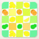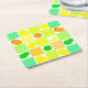 Ein farbenfroher Untersetzer mit Zitrusfrüchtemuster aus Zitronen, Limetten und Orangen auf weißen, orangefarbenen, aquamarinen und gelben Plätzen.