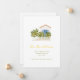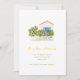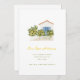 Eine charmante neue Adresse/neue Zuhause-Ankündigung mit einer Aquarelldarstellung eines weißen und blauen Bungalow-Hauses mit Zitronenbäumen und einem weißen Zaun.