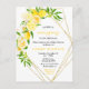 This fun and whimsical baby shower postcard features watercolor citrus lemons and foliage on a gold geometric frame. The text combines handwritten script and serif fonts for a stylish and modern look. This is perfect for a summer rustic baby shower.