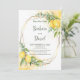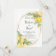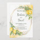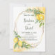 Eukalyptus-Zitronen Gelbe Blumen Save the Date Karte. Der romantische Stil mit Aquarelllemonen, gelben Blumen und Eukalyptus ist perfekt für eine rustikale Hochzeit im Sommer. Die geometrischen Imitate mit Goldfolienrahmen fügen eine moderne Touch hinzu. Der Aquarell-Spritzer ergänzt die Komposition und verleiht ihr einen besonderen Charme.