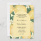 Elegante Aquarellmalerei von Zitronen und Grünpflanzen mit weißen Zitrusblüten, Ihr Hochzeitstext ist auf einem blassgelben gewölbten Einzug dargestellt und die Details für Ihre Hochzeit sind auf der Rückseite. PASSENDE Artikel in unserem Shop erhältlich.