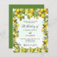 Ein grüner, wasserfarbener Hintergrund. Gelbe Zitronen und grünes Blattwerk. Personalisieren Sie Ihre Namen und Details und fügen Sie diese hinzu. Der Name wird mit einem handgeschriebenen Stilskript geschrieben. Zurück: grüner Hintergrund. 1 Blatt = 1 Einladung mit Druckkante bis Kante.