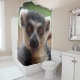 Der Duschvorhang, der mit einem niedlichen wachsamen mit Augen Madagaskar-Ring entworfen war, band den Lemur an, der heraus seine Zunge haftet.