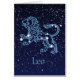 Karte mit dem Zodiaksymbol für Leo in weichem silberblauem Blau, überlagert mit den Sternen der Sterne, vor einem Sternenhimmel-Hintergrund, gestuft von tiefer Mitternacht Blau bis schwarz.