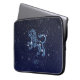 Laptop-Ärmel mit dem Symbol für Leo in weichem silberblauem Blau, überlagert mit den Sternen der Sterne, vor einem Sternenhimmel Hintergrund gestuft von tief Mitternacht blau bis schwarz