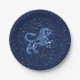 Papiertafel mit dem Symbol für Leo in weichem silberblauem Blau, überlagert mit den Sternen des Sternbildes, vor einem Sternenhimmel in tiefblauem Mitternachtsblau