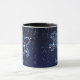 Tasse mit dem Zodiaksymbol für Leo in sanft silberblau, überlagert mit den Sternen des Sternbildes, vor einem Sternenhimmel, der von tief Mitternacht blau bis schwarz gestuft wird
