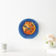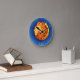 Die farbenfrohe Wanduhr ist mit einem blauen Hintergrund mit einem Löwengesicht versehen, einem astrologischen Symbol für Leo.