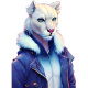 Una imagen IA de un león alvino elegante con una cazadora azul