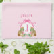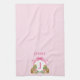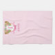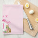 This kitchen towel has a preppy grandmillennial crest design featuring a leopard wearing a wreath with a monogram letter in the center on a pink background. You can personalize with your initial and name