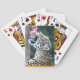 Große Katze hält an einem Baum fest, der sein Essen auf einem Kartendeck isst.