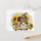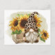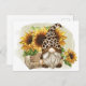 Ein hübscher kleiner Gnome in einem Leopardenprint hat Sonnenblumen gesammelt.