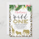 Dieses süße Design verfügt über drei Imitat Gold Glitzer Safari Tiere und Wort. Ebenfalls im Design enthalten ist eine Leopardenhaut oder eine Käfighaut und einige tropische Blattwerk und Blume. Dieses Design ist ein niedlicher Weg, um die Gäste zu einem ersten Geburtstag einzuladen, und ideal für alle, die Leopardenhautmuster mögen.