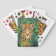 Kartenspielen in einem Leopard mit hellen, intensiven Augen, die durch üppiges grünes Laub schrecken. Der scharfe Kontrast zwischen dem gepunkteten Pelz des Leoparden und den lebhaften Blätter schafft einen auffallenden visuellen Effekt.