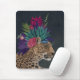 Hot House Leopard 1 von Fab Funky. Eine Leoparden-Erholung mit tropischen Blume und Grünpflanzen auf dem Kopf wie ein Kopfstück. | 192441GG