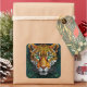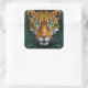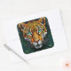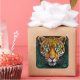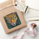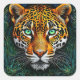 Auffallendes und hochdetailliertes Portrait eines Leoparden. Sein Gesicht dominiert die Komposition und zeigt lebendiges orangefarbenes Fell mit schwarzen Flecken. Die Augen des Leoparden sind ein intensives Smaragdgrün, das sofortige Aufmerksamkeit zeichne. Die Umgebung ist von üppiger Vegetation und Blätter umgeben, was die wilde und lebendige Atmosphäre des Stückes unterstreicht. Die Gesamtkunst betont die Schönheit und Majestät des Leoparden und schafft so eine faszinierende und kraftvolle Präsenz.