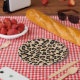 Teller in Leoparden in schwarz-rostbraunen Flecken auf beigefarbenem Hintergrund