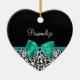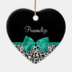 Personalisieren Sie, indem Sie den Namen eines Girly Girly Girl zu diesem modischen schwarz-weiß leopard drucken herzförmigen Ornament mit einem mädchenhaften grünen Band in einem niedlichen Bogen. Dieses stilvolle Tierdesign ist ein flaches gedrucktes Bild und enthält kein echtes Band.