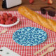 Papier-Teller in einem Leopardenprint in dunkelblauem Denim-Blau mit mittlerem Blau auf pastellblauem Hintergrund