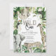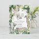 Eine geschlechtsneutrale Safari-Einladung zum ersten Geburtstag in der Wildnis bietet einen tropischen Dschungel mit Schlamm, Affen, Giraffen, Elefanten, Tucan und Leopard. Auf der Rückseite des Einladens befindet sich Leopardruckhintergrund mit tropischen Pflanze und Löwe.